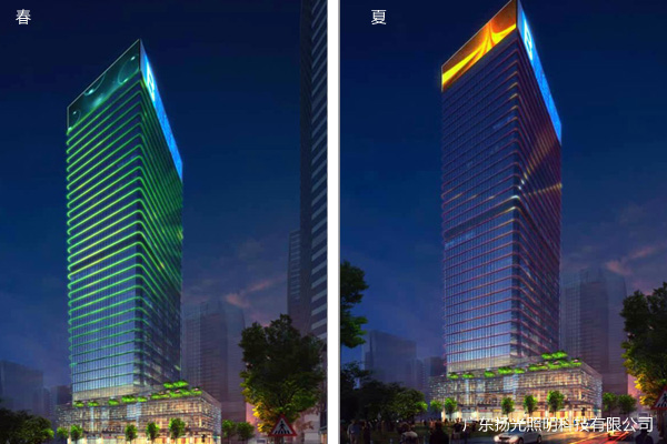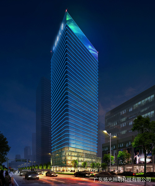 根據(jù)對(duì)建筑主體的解析,頂部在西北面設(shè)置的LED顯示屏,東南而設(shè)置企業(yè)LOGO來增強(qiáng)建筑的標(biāo)識(shí)度,立面采用燈管勾勒,有效的表現(xiàn)出建筑龍骨結(jié)構(gòu)的層次感,通過線條變化體現(xiàn)出城市高效發(fā)展的速度。