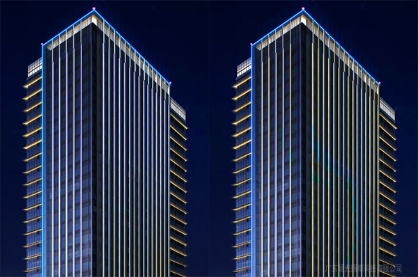 頂部半透明玻璃遮陽板后面投射燈光,營(yíng)造發(fā)光效果;利用豎向鋁板線條鋪設(shè)燈光,燈光可電腦操控,可預(yù)設(shè)多種圖案;裙樓在樓板之間加燈光,要求發(fā)光亮度高。
