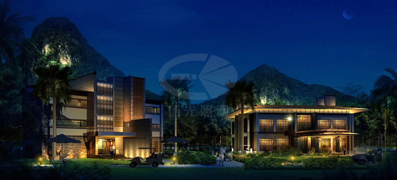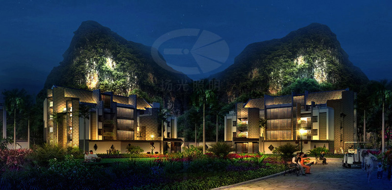 兩側(cè)山體使用4000K暖白光照亮,還原夜間綠植與山體日間色彩。更特顯金碧輝煌的入口門廊。