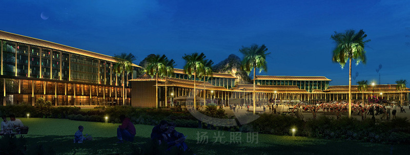 廣場商業(yè)街、宿舍位于項目中心位置,是人流聚集點,夜間為亮度最高區(qū)域。運用燈具大面積洗亮建筑頂部,使其成為區(qū)域內(nèi)的視覺焦點。吸引人群聚集于此。