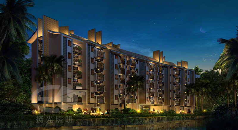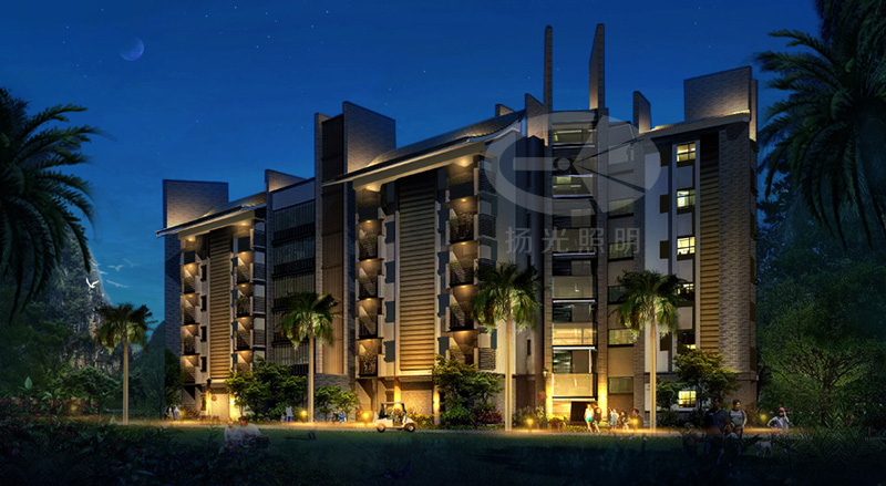 住宅燈光以靜謐的燈光氛圍為主,充分結(jié)合建筑特色,運用“點線面”燈光手法,強調(diào)建筑夜景特色。重點交代建筑頂部與入口在夜間的主次關(guān)系。