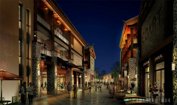 作為縱向街道通向街區(qū)的主要人氣通道,寬敞舒適,通過建筑立面的壁燈和景觀燈的結(jié)合,完成整個縱向空間的照明。