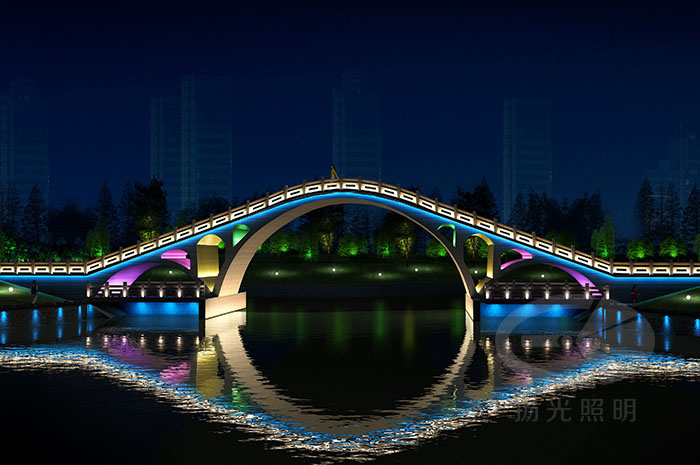 石拱橋、景觀橋是橋墩和橋身自然地連接為一體,而且體量不是特別大,所以采用泛光照明時(shí),一般是將橋身側(cè)面和橋墩側(cè)面一并照亮,通過將泛光燈具設(shè)置在河兩岸靠近橋墩處,與橋身側(cè)面成一定角度向橋身投光。