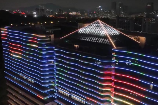 建筑頂部幕墻采用 RGBW 全彩燈光,通過智能控制,以立面動(dòng)態(tài)圖案與定制動(dòng)畫演繹企業(yè)形象,吸引多視角關(guān)注,深化企業(yè)品牌辨識(shí)度;控制系統(tǒng)設(shè)置平日、節(jié)假日模式,可根據(jù)不同節(jié)日定制專屬光影內(nèi)容,并與廣場(chǎng)噴泉實(shí)現(xiàn)光影聯(lián)動(dòng),營造不同的場(chǎng)景氛圍。樓身則以大功率燈光做整體烘托,通過光影塑造建筑體量,強(qiáng)化空間視覺存在感。